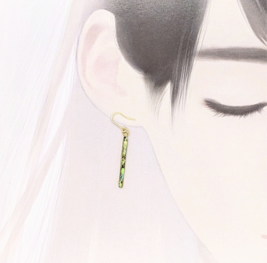 1つの面に貼り付けたグリーン螺鈿の美しい色合いと、3センチのゴールドスティックが絶妙なバランスを創り出し、揺れるたびに煌めきが楽しめます。