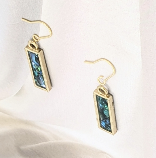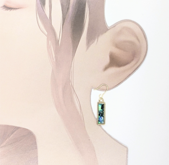 ゴールドメタルの枠に美しいグリーン螺鈿が輝く、エレガントで上品なピアスイヤリングです。独特の輝きを放つ螺鈿が、揺れるたびに煌めき、周囲の視線を引き付けます。その短冊の形状は、19☓7ミリというちょうどいい大きさで、洗練された装いにぴったりマッチします。