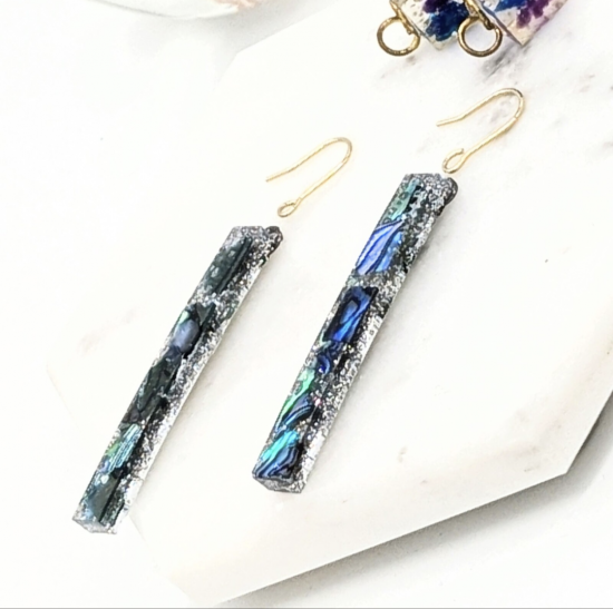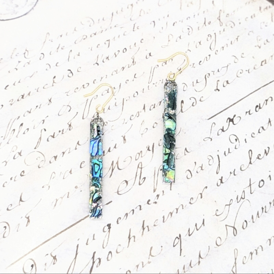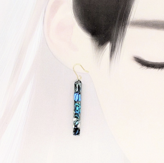 ブルー螺鈿の美しさが際立つ、「ブルー螺鈿の銀継ぎ風スティックピアスイヤリング」が登場しました。背景に配された銀ラメが、螺鈿の模様を美しく引き立て、耳元で揺れるたびに優雅な輝きを放ちます。