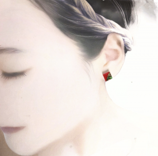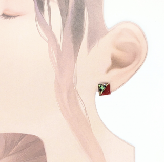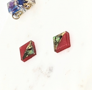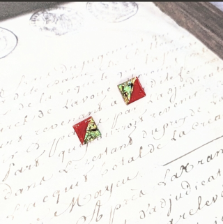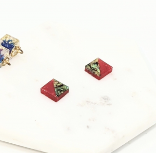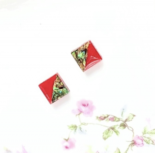 鮮やかなグリーン螺鈿と赤のスクエアピアスイヤリングは、対比の美しさであなたの耳元を彩ります。