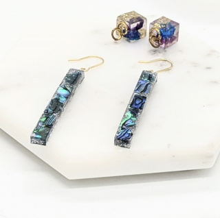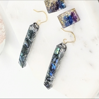 ブルー螺鈿の美しさが際立つ、「ブルー螺鈿の銀継ぎ風スティックピアスイヤリング」が登場しました。背景に配された銀ラメが、螺鈿の模様を美しく引き立て、耳元で揺れるたびに優雅な輝きを放ちます。