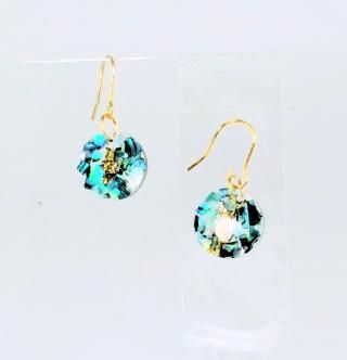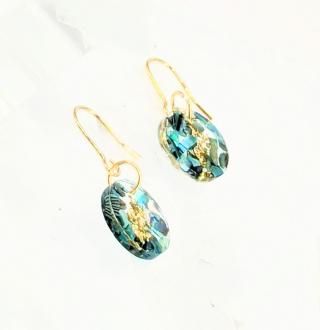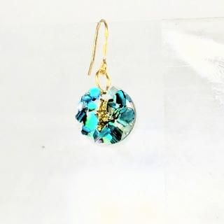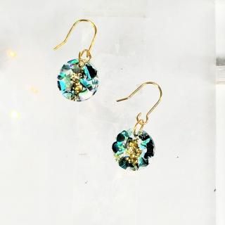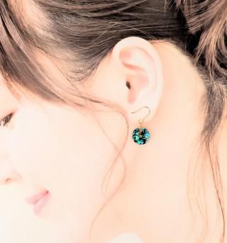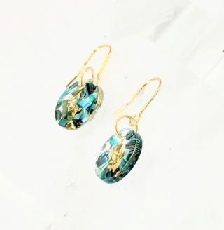 グリーン螺鈿の繊細な美しさとゴールドの華やかな輝きが見事に調和した、ドロップピアスイヤリングをご紹介します。