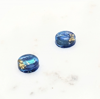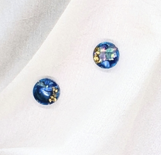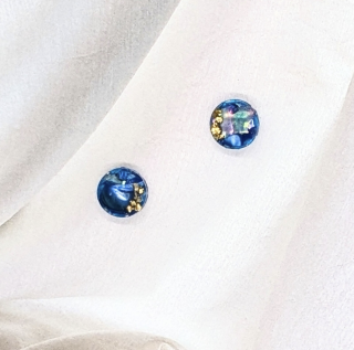ブルー螺鈿とゴールドの絶妙なコントラストが目を奪う、このラウンドピアスイヤリングは、透明感と存在感を兼ね備えた一品です。